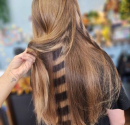 - Мастер наносит чередующиеся светлые и тёмные полосы по горизонтали, в результате прядь выглядит как хвост енота.